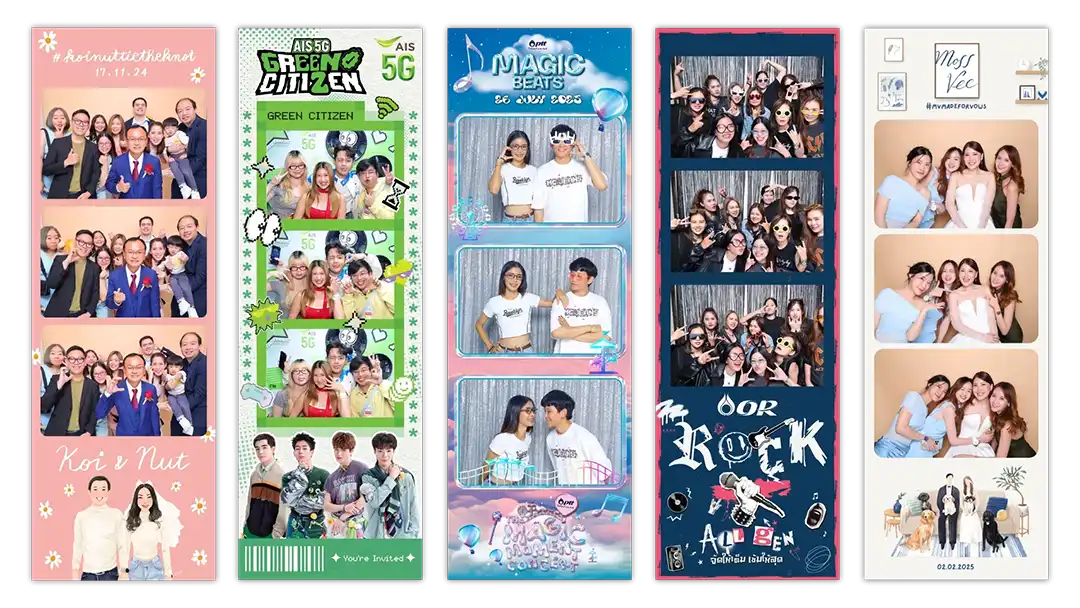 สามารถออกแบบเทมเพลต Photobooth ฟรี ให้เข้ากับธีมงานได้ ใส่ชื่อบ่าวสาว วันที่จัดงาน โลโก้บริษัท หรือโทนสีตามคอนเซ็ปต์ เพื่อให้ภาพทุกใบเป็นของที่ระลึกเฉพาะงานของคุณ