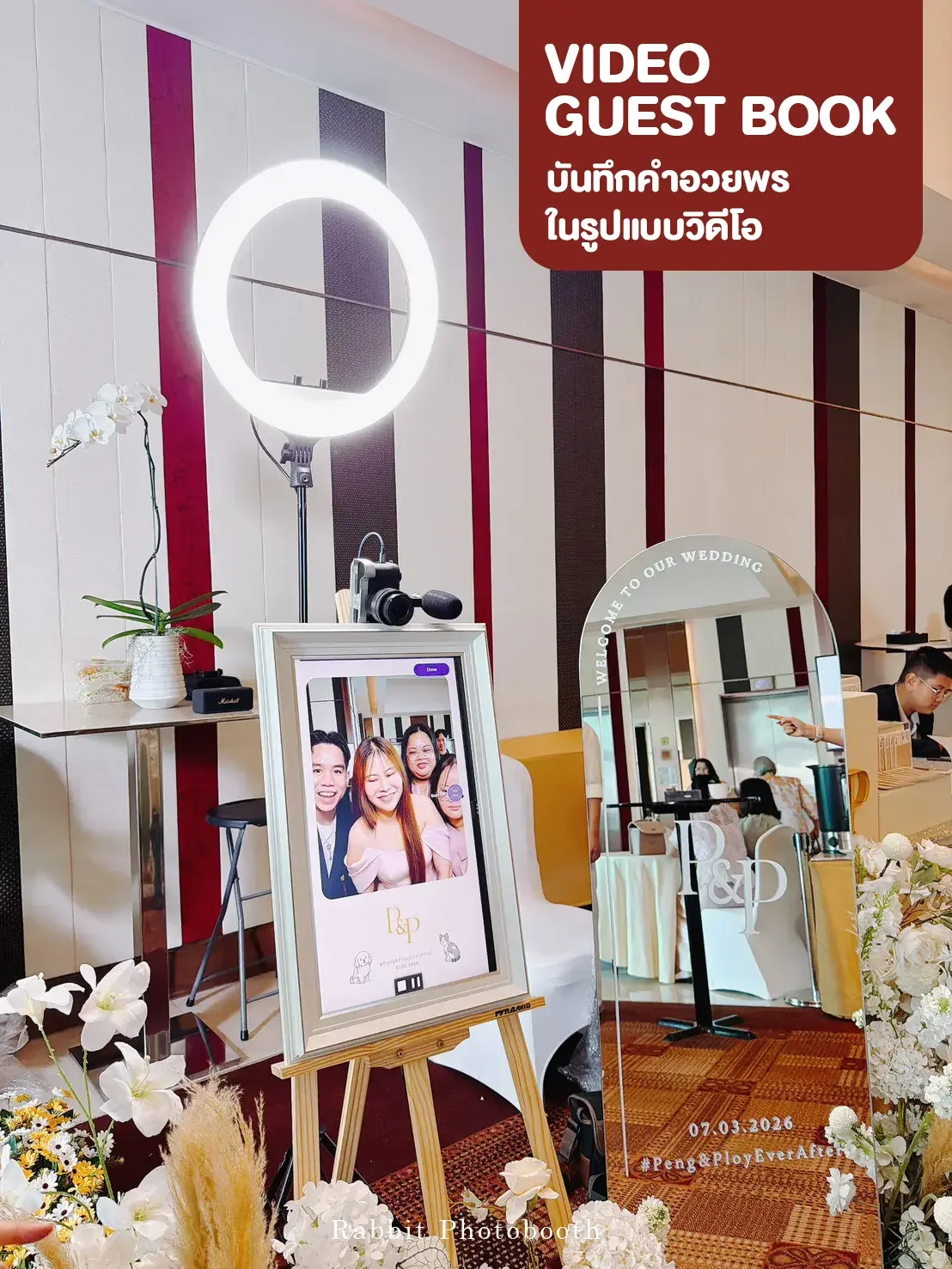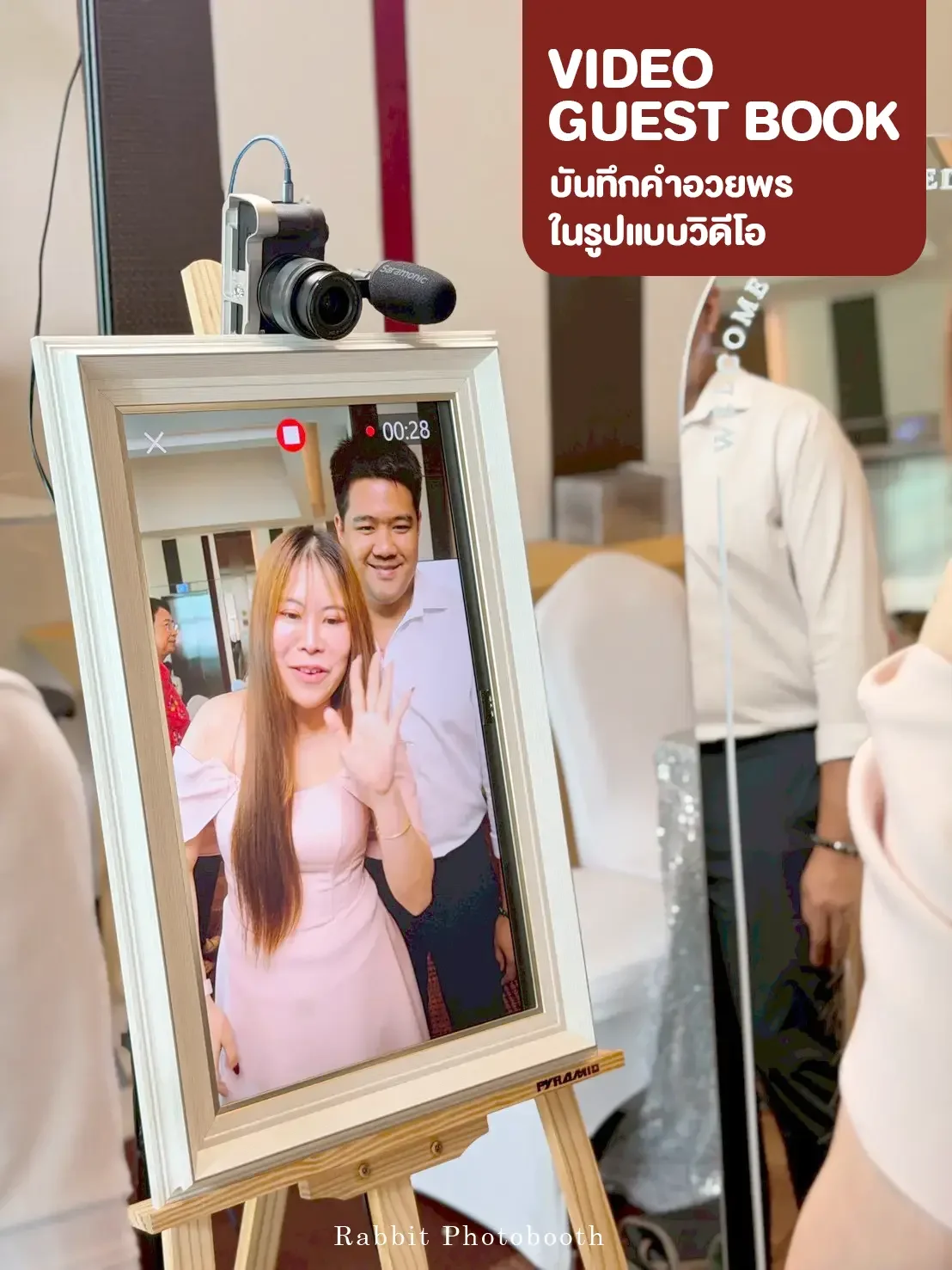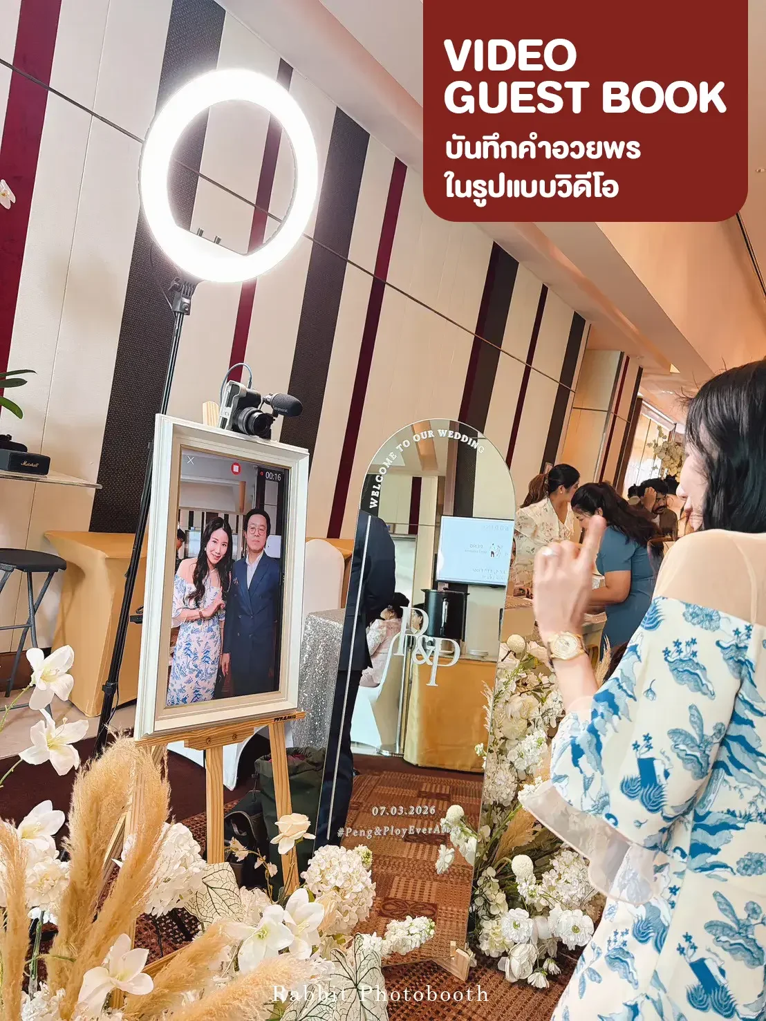 Professional wedding video guestbook service in Bangkok Thailand by Rabbit Photobooth. Guests record video messages for the bride and groom using a DSLR camera and touchscreen booth, creating a memorable digital guestbook experience.