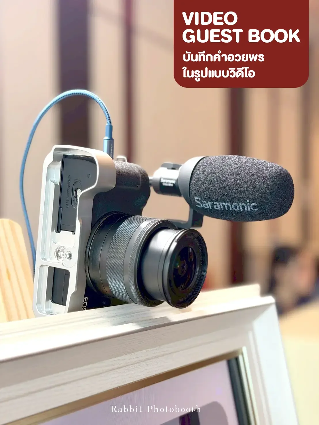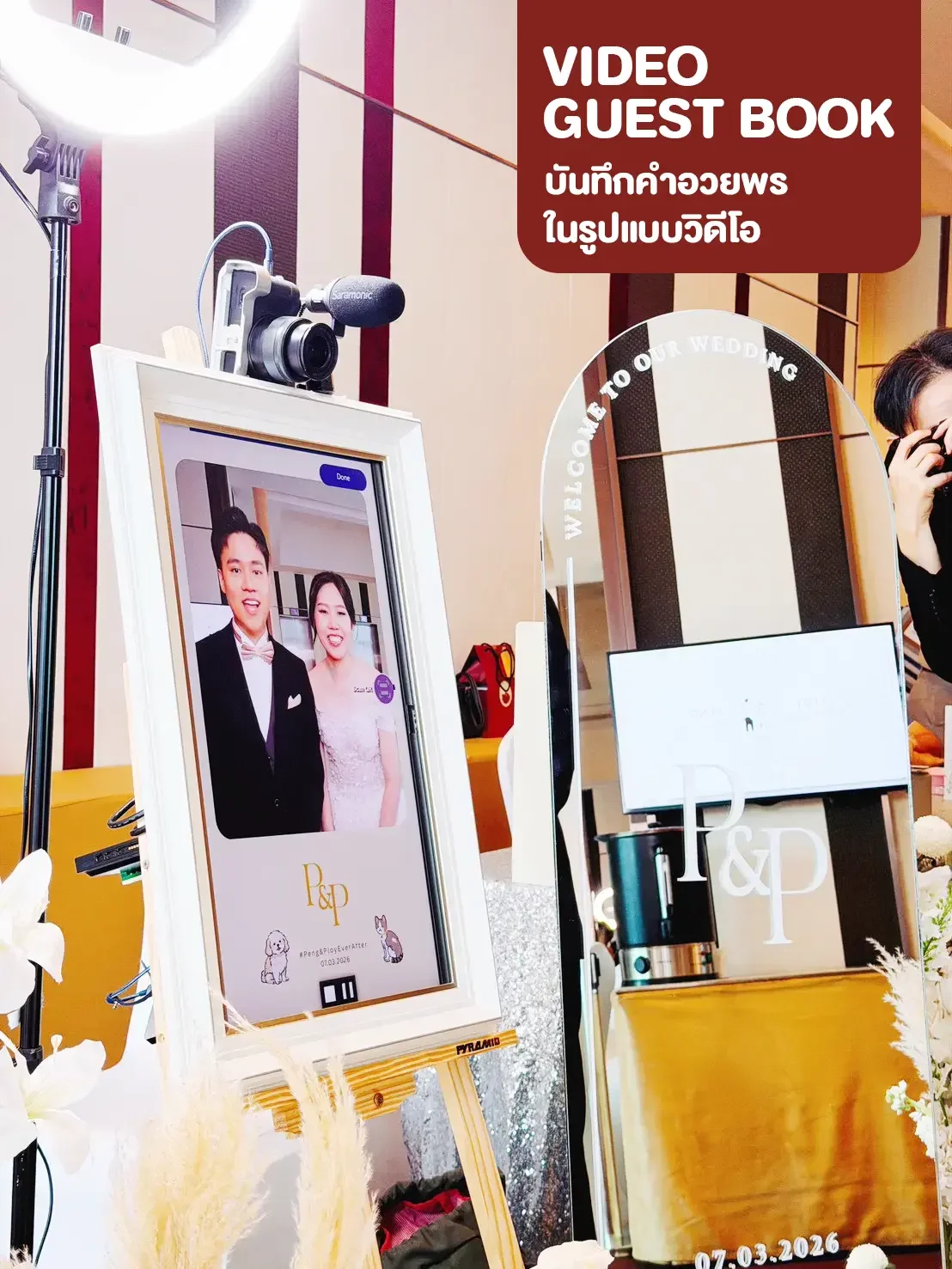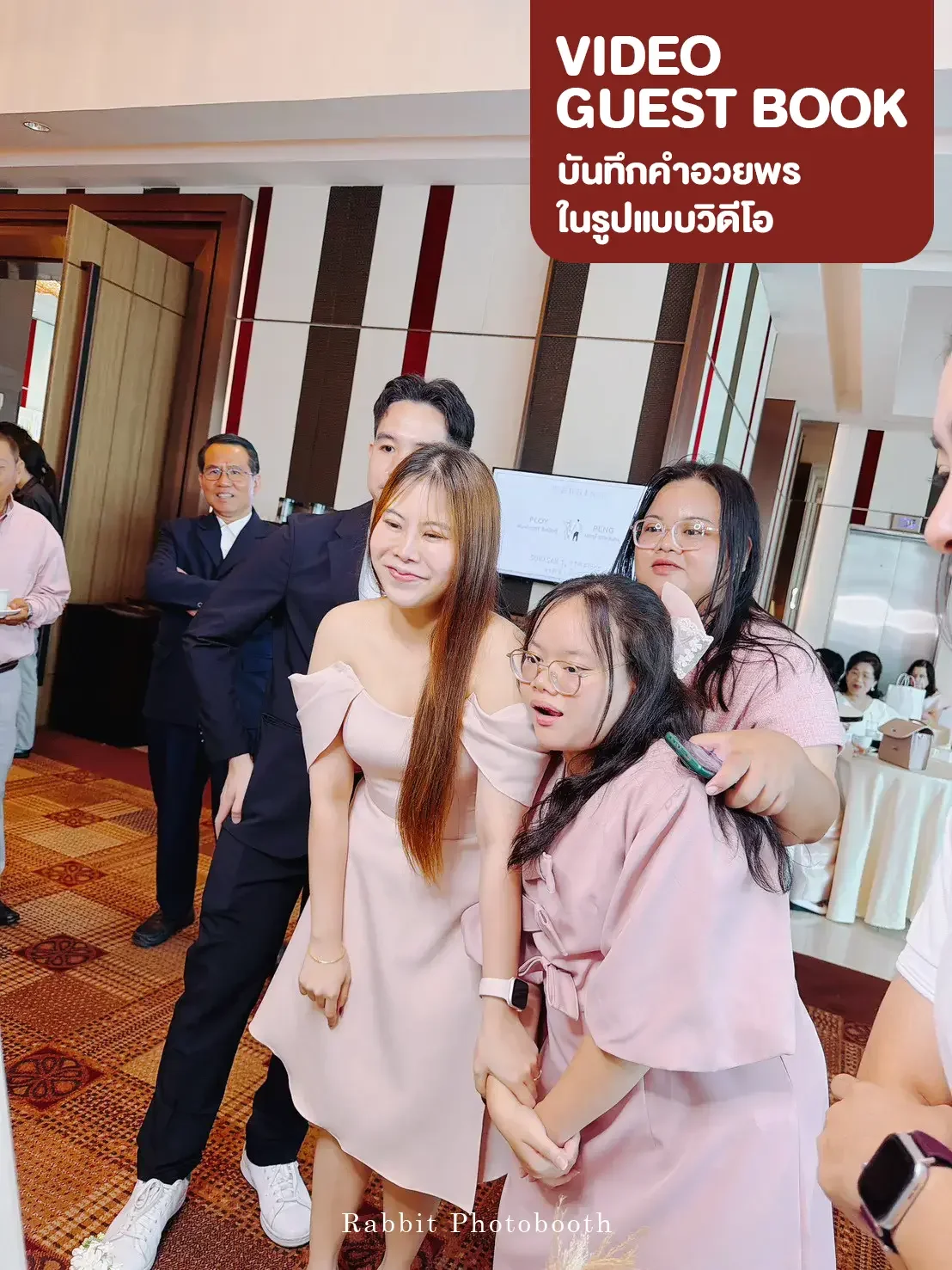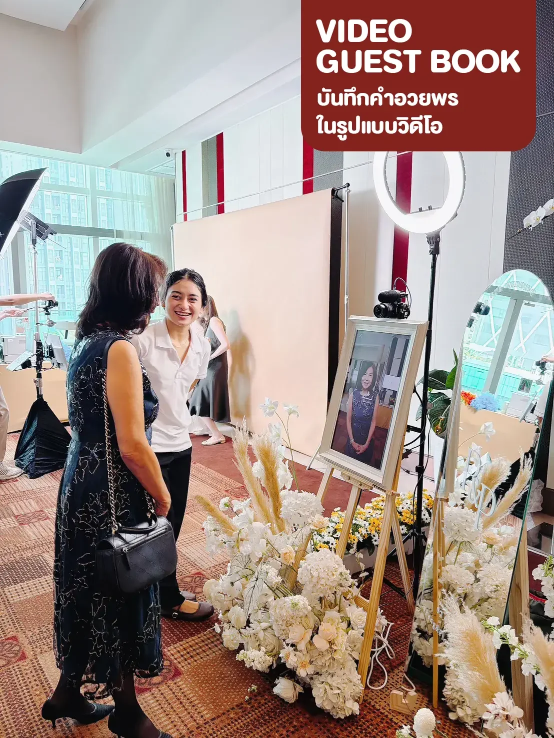 Professional wedding video guestbook service in Bangkok Thailand by Rabbit Photobooth. Guests record video messages for the bride and groom using a DSLR camera and touchscreen booth, creating a memorable digital guestbook experience.